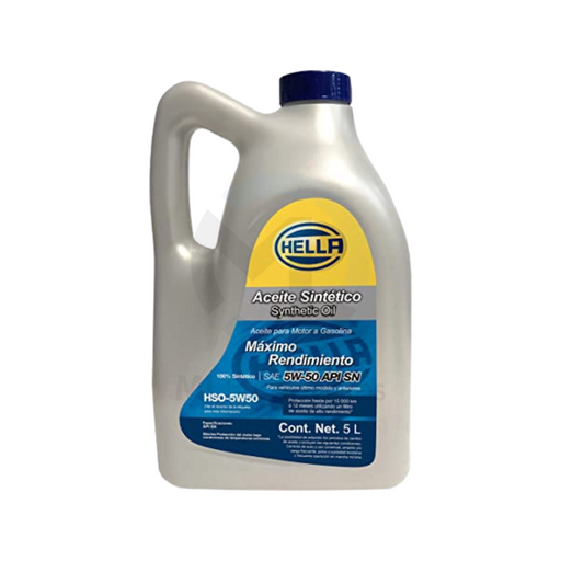 HellaAgotadoAceite de Motor 5W50 API SN, marca Hella 100% Sintético, presentación Garrafa 5 litros. Características: •Diseñado para cumplir los criterios de a...