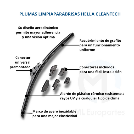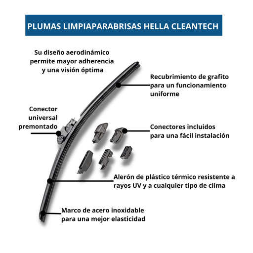 Hella2 piezas disponiblesPlumas limpiaparabrisas delanteras marca Hella, Medidas 22" y 16"(pulgadas), tipo Cleantech, con hojas de goma recubiertas de grafito. Contiene ada...